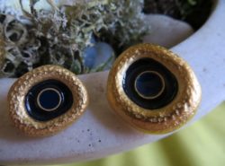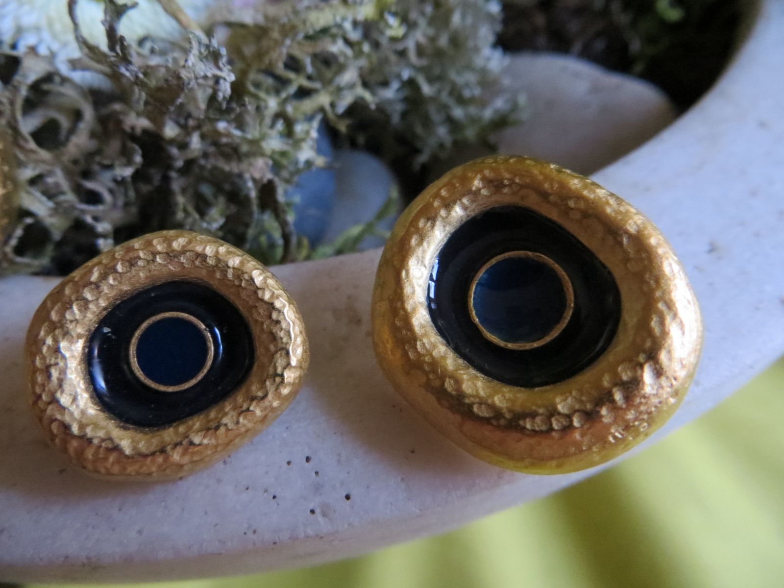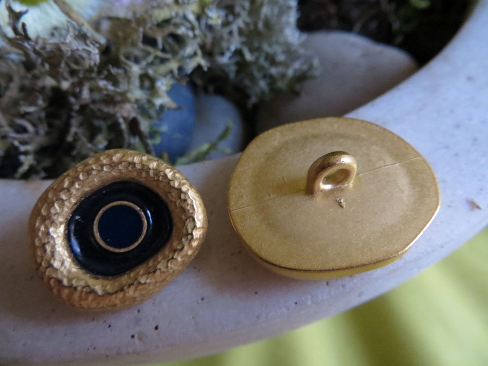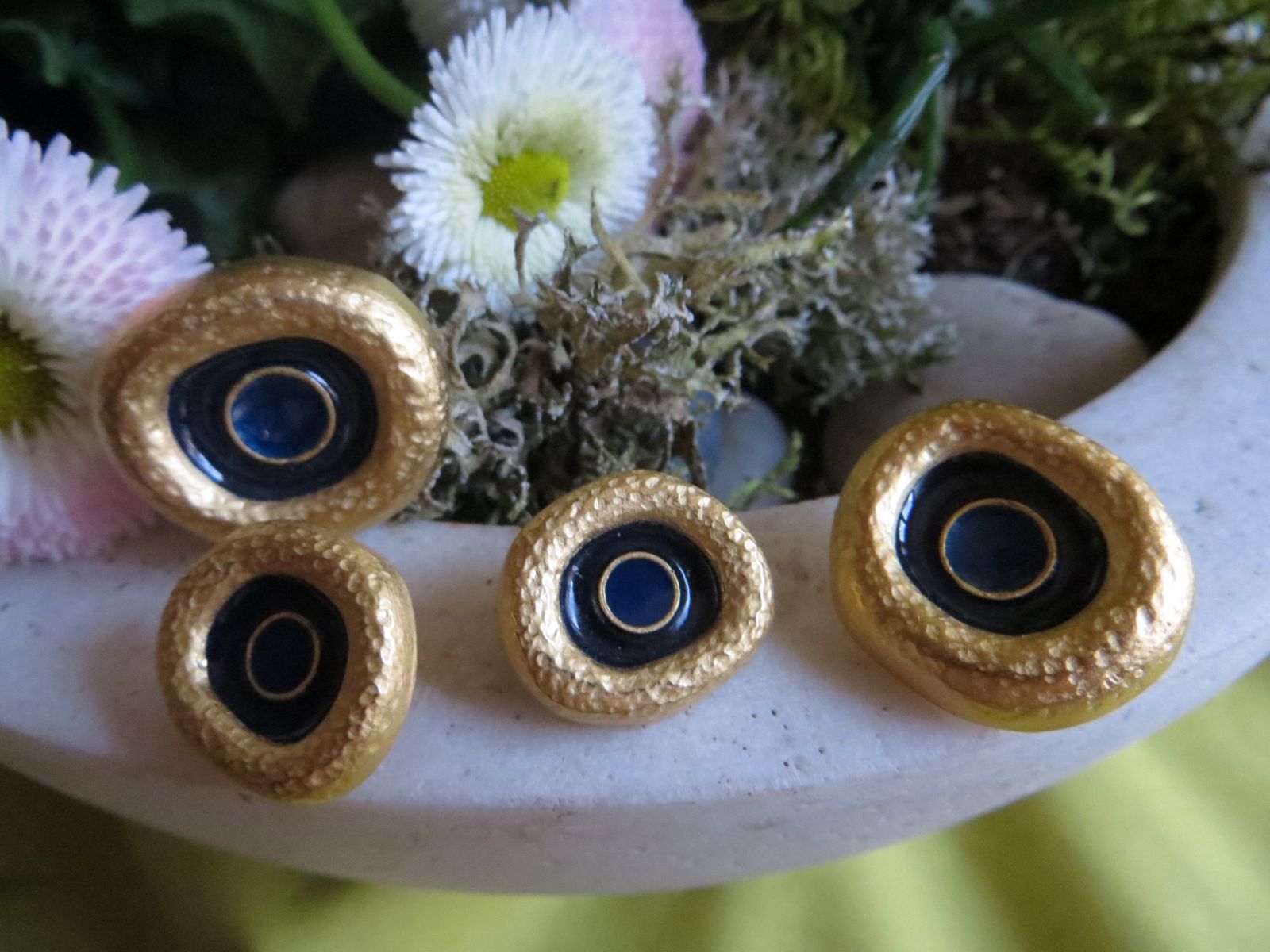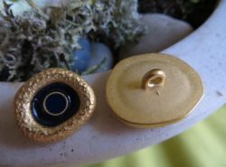 bouton en plastique métallisé un peu épais mais très léger. couronne martelé de couleur or de forme irrégulière. le centre rond bleu , entouré de marine. 2 tailles 19 et 25mm. prix à l'unité
