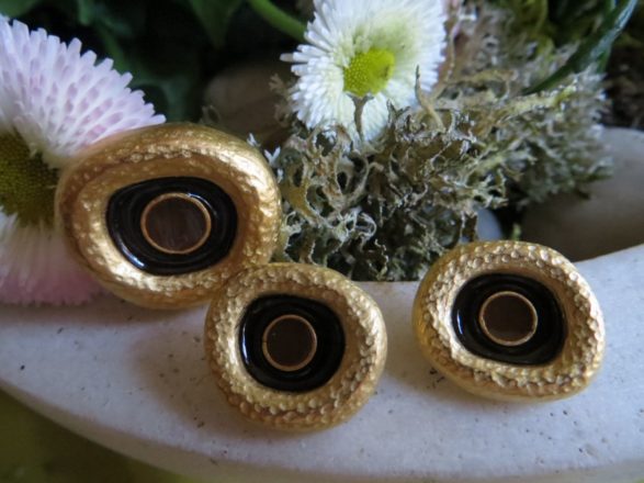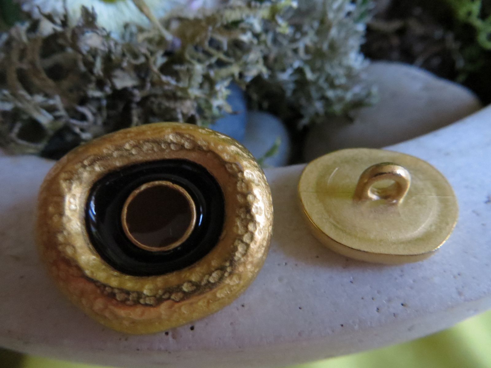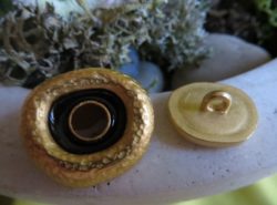 bouton en plastique métallisé un peu épais mais très léger. couronne martelé de couleur or de forme irrégulière. le centre rond caramel , entouré de marron. 2 tailles 19 et 25mm. prix à l'unité