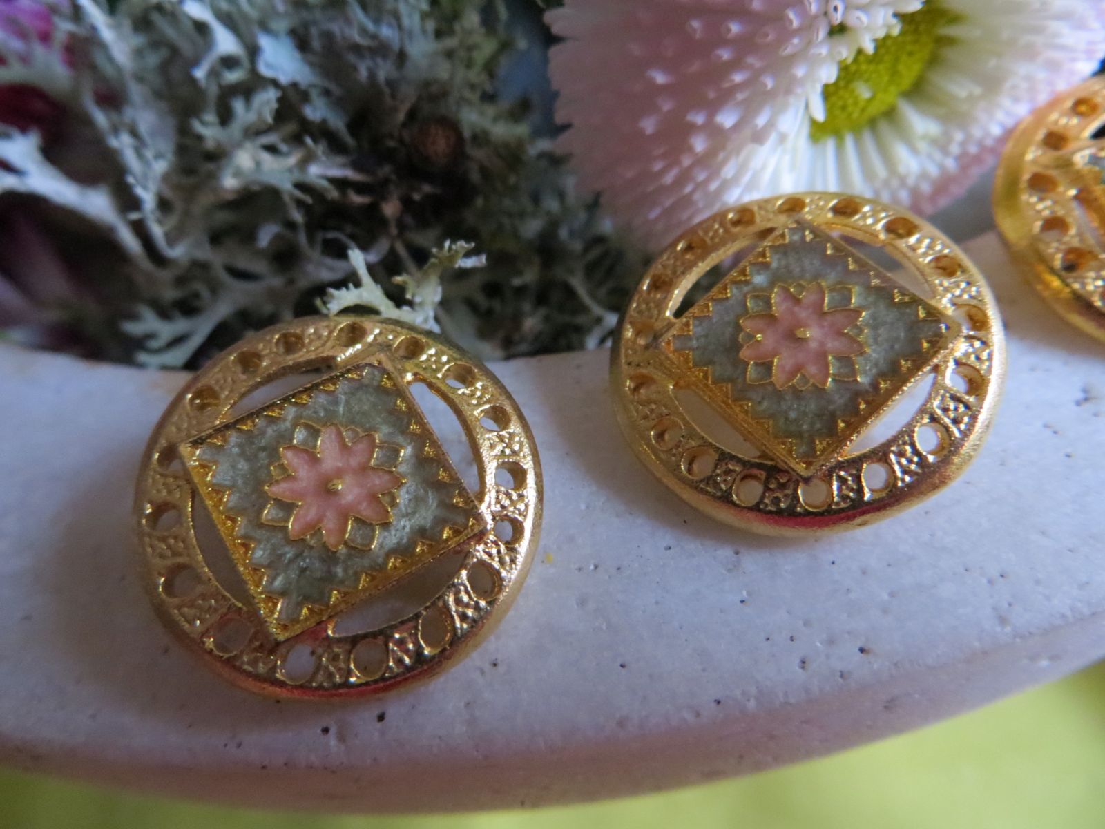 Bouton tout en métal à pied. Motif émaillé au carré gris et fleur rose entourée par une couronne dorée ajourée. Ø20mm. Prix à l'unité.