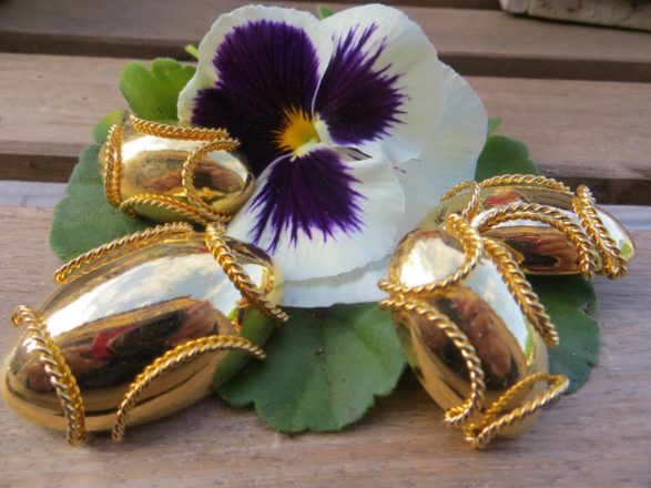 Bouton en métal or brillant, 4 arceaux repliés sur ce bombé pour en faire un joli bijou, creux et léger.