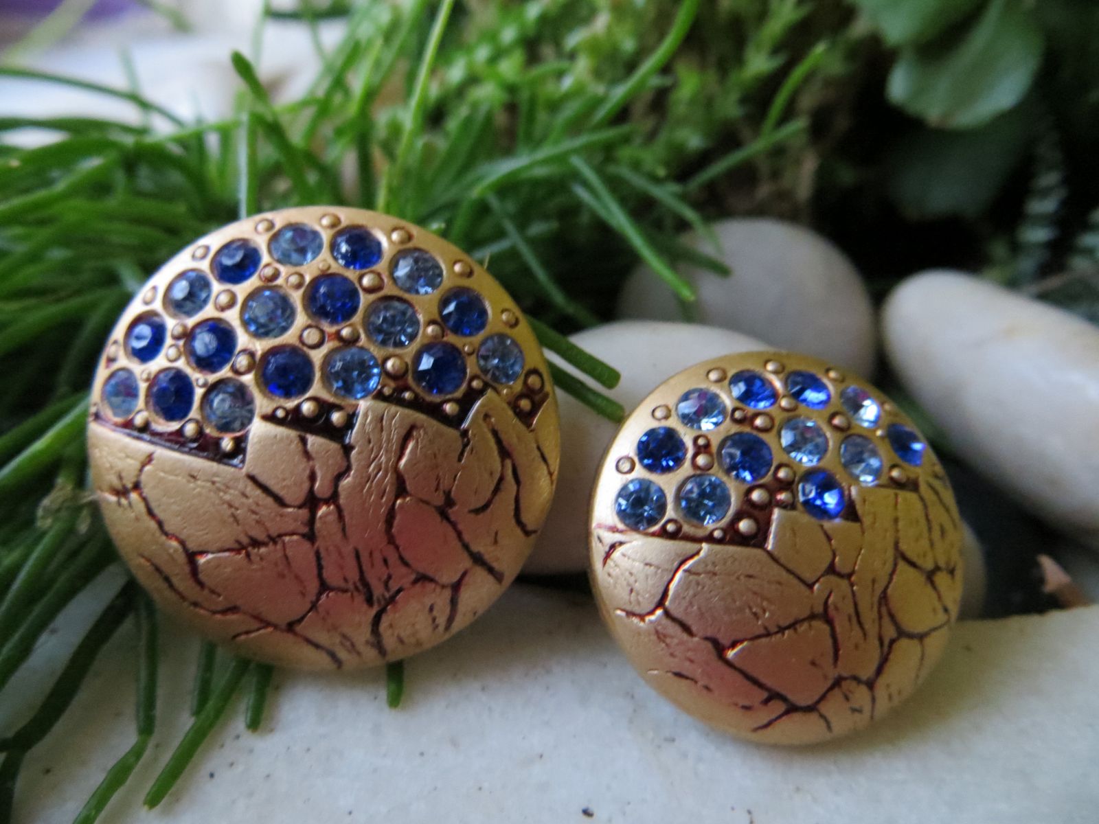 très joli bouton entièrement en métal or mate clair inclusion d'un camaïeu de strass bleus 2 tailles, Ø27mm, 5 grammes à 5.80€ pièce Ø22mm, 4.5 grammes à 4.20€ pièce