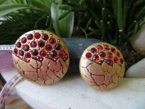 très joli bouton entièrement en métal or mate clair inclusion d'un camaïeu de strass rouges Ø22mm, 4.5 grammes à 4.20€ pièce
