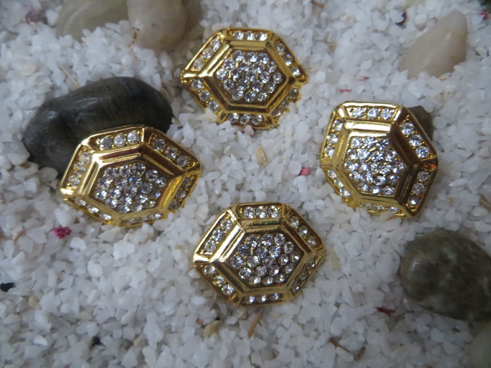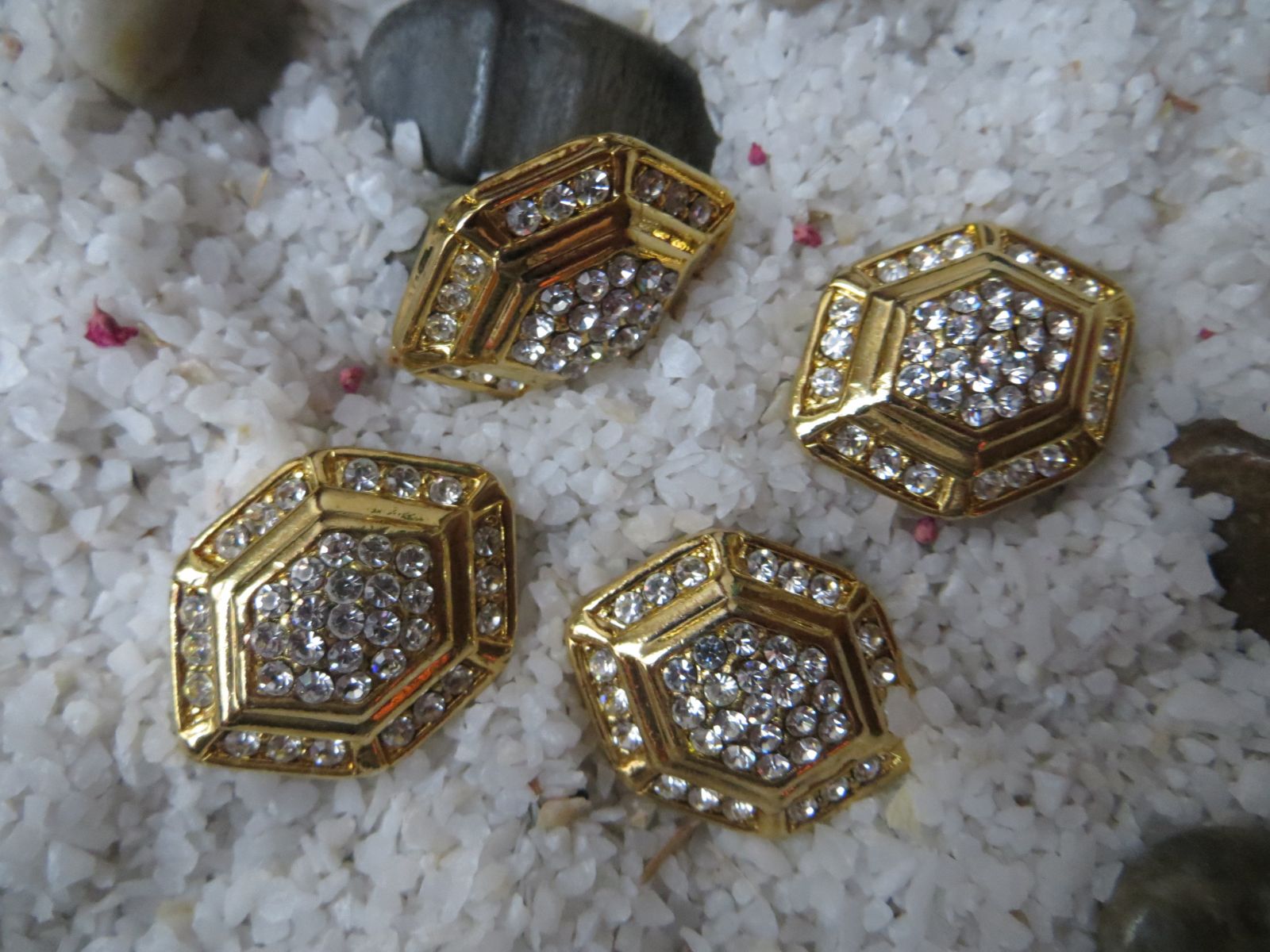Ravissants boutons, strass collés sur métal doré. 29 x 21mm, épaisseur 8mm. Prix du lot des 4 pièces. Fixation par pied. Vente unique.