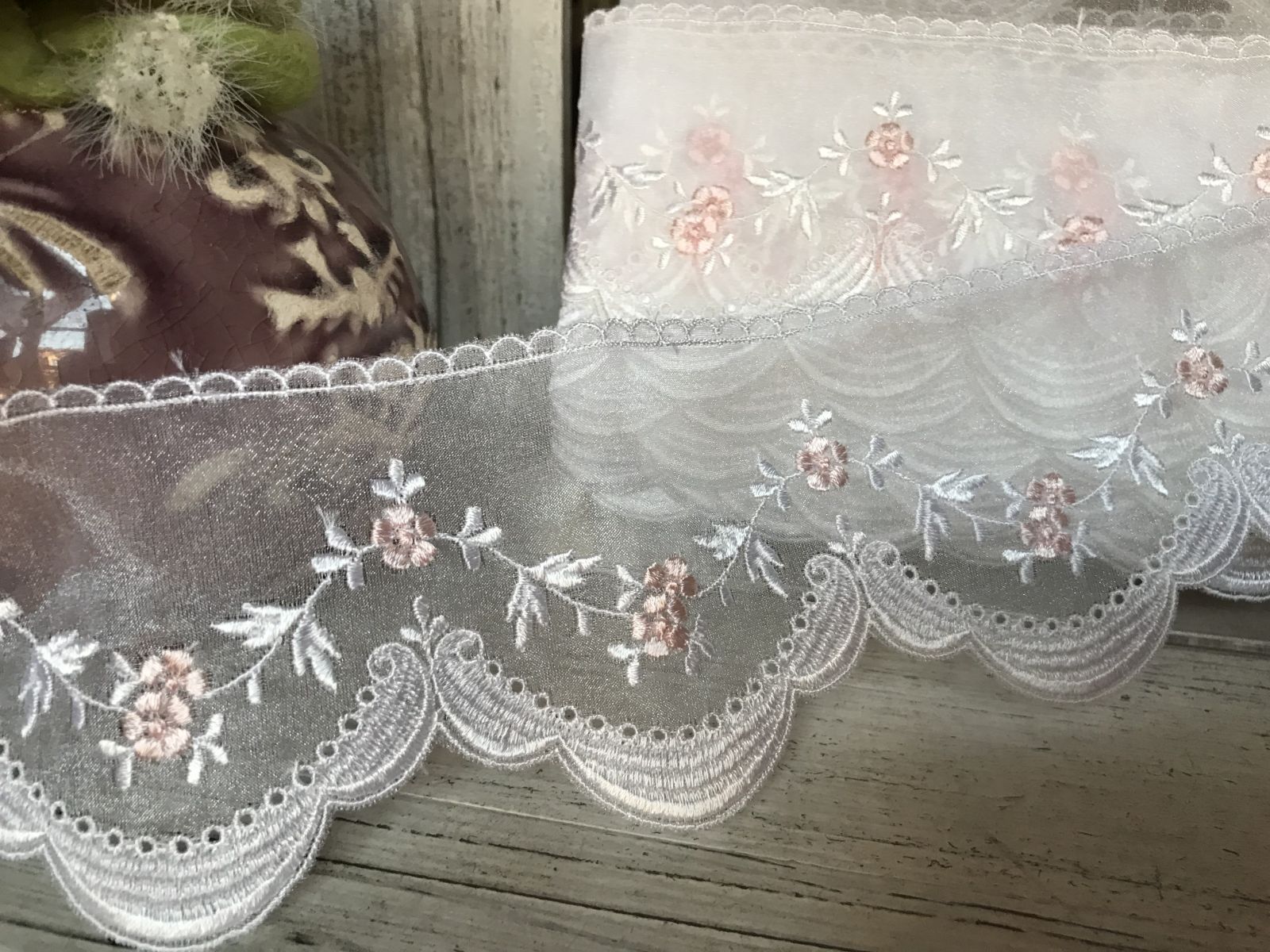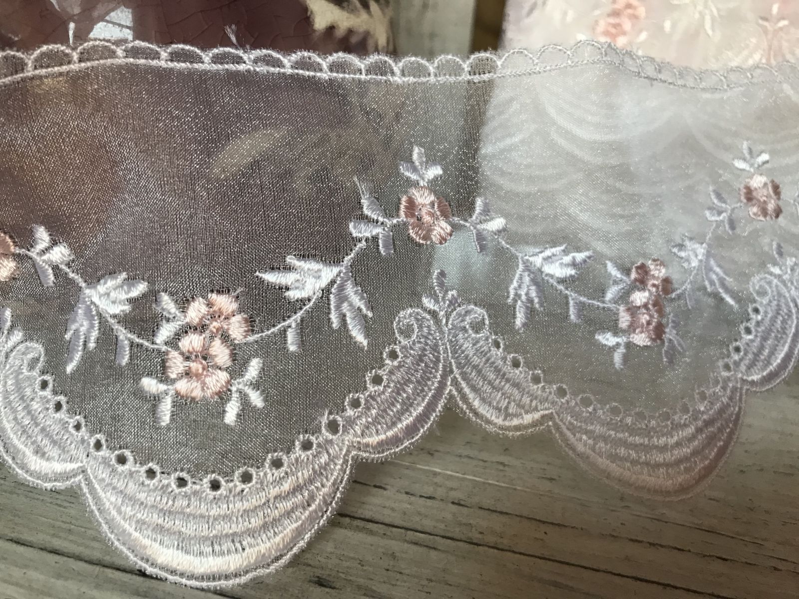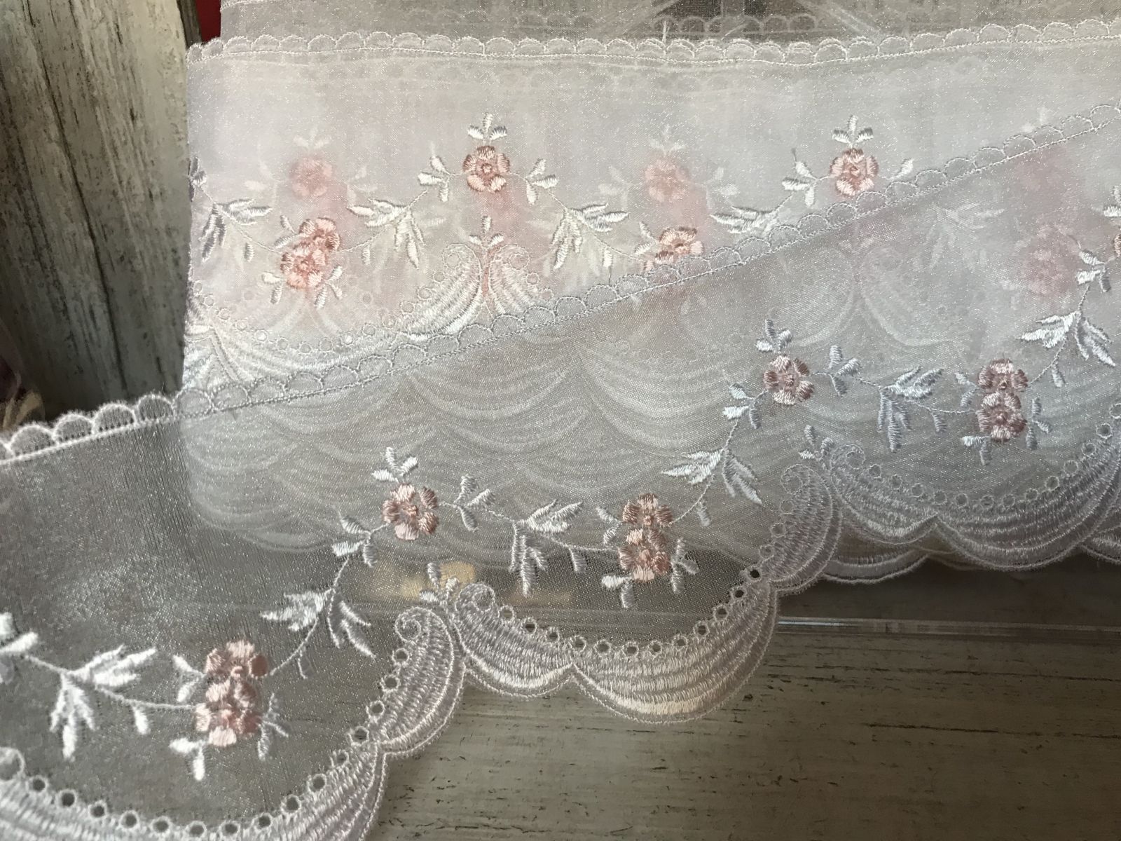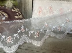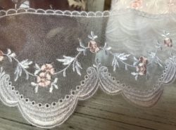 Dentelle festonnée en matière synthétique hauteur 85mm avec motifs brodés et ajourés.